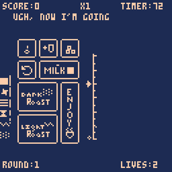 You'll also notice that you're on a strict timer. That's how we do it here at RoastMaster™. Take too long to serve the customer, and they leave. You'll lose a life, of which you only have 3. Be careful. We do not provide health insurance.